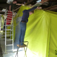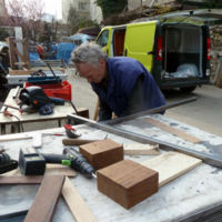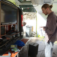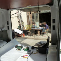 Cette camionnette aménagée est le fruit d’un long travail de réflexion pour répondre au mieux à un cahier des charges exigeant : un outil souple, montage et démontage rapide, autonomie énergétique, hauteur permettant l’accès au parkings souterrains, rangement optimisé, etc.